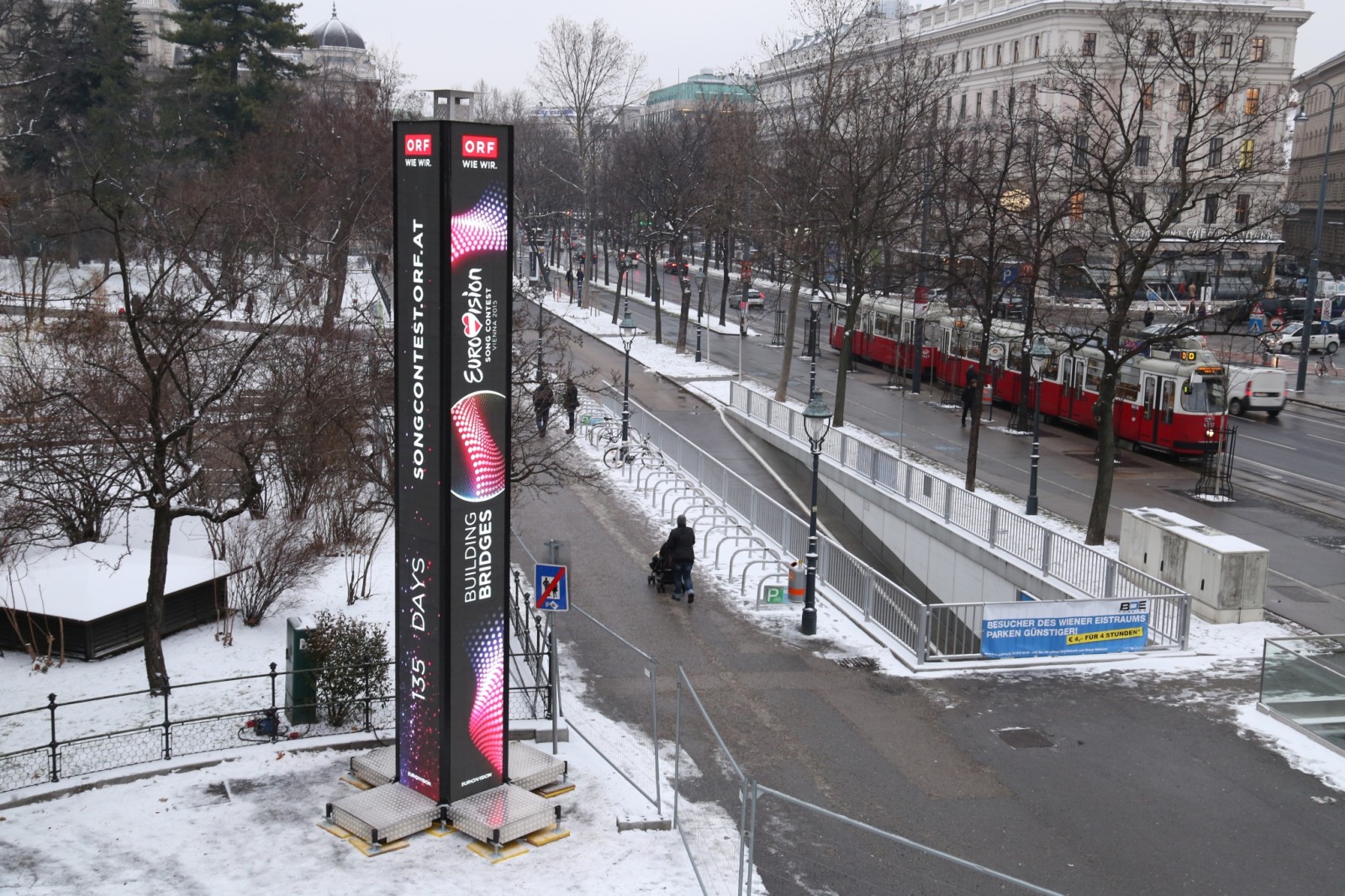Ovaj toranj, pored već brendiranog tramvaja koji je na gradskim ulicama od 27. decembra, već sada podseća stanovnike Beča i njegove posetioce da će u maju biti domaćin najvećeg muzičkog događaja u Evropi. Toranj oblika kvadra je visok približno 8 metara i težak 4900 kg, obložen je LED ekranima površine 23,6 kvadratna metra i na njemu se nalazi logo takmičenja i slogan „Buliding bridges“ (Gradimo mostove). Interesantno je da može da izdrži brzinu vetra od 130 km/h. Osim odbrojavanja preostalog vremena do finala, odbrojava se i broj dana, sati, minuta i sekundi do ceremonije predaje ključeva Evrovizije, zakazane za 26. januar, kada će ih gradonačelnik Kopenhagena simbolično uručiti gradonačelniku Beča Mihaelu Hojplu. Tog dana će se održati i žreb za polufinala.