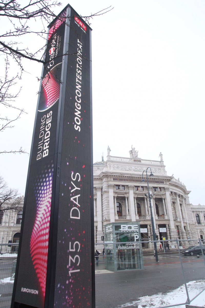 Do finala Pesme Evrovizije u Beču, koje će se održati u subotu, 23. maja sa početkom u 21 čas, ostalo je tačno 135 dana. Na naslovnoj strani našeg sajta možete videti brojač u danima, satima i minutima, a odbrojavanje je danas otpočelo i u Beču, postavljanjem evrovizijskog tornja na trgu Rathausplatz na kome je ispisan broj preostalih dana do glavnog događaja, velikog finala Pesme Evrovizije 2015.