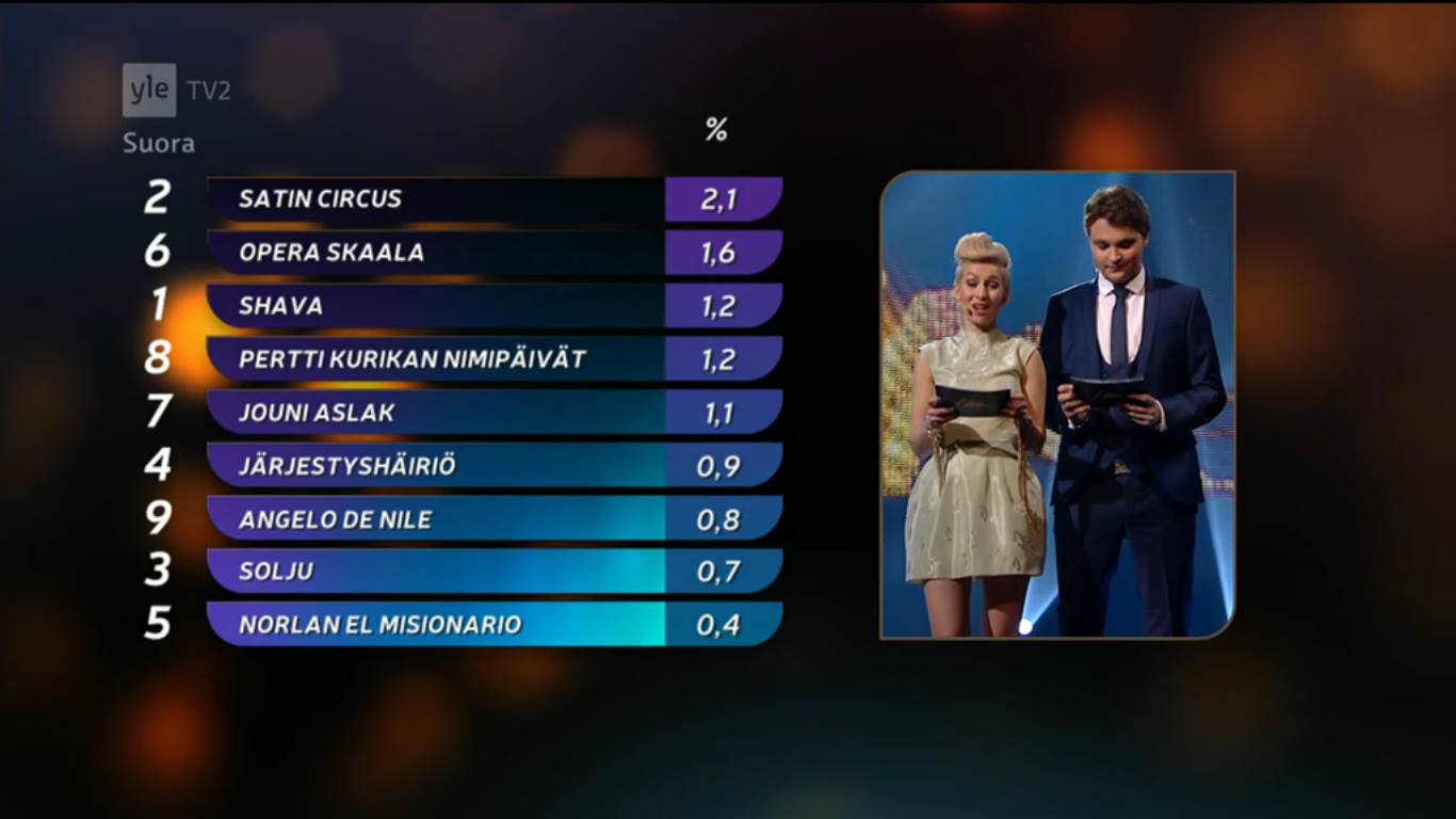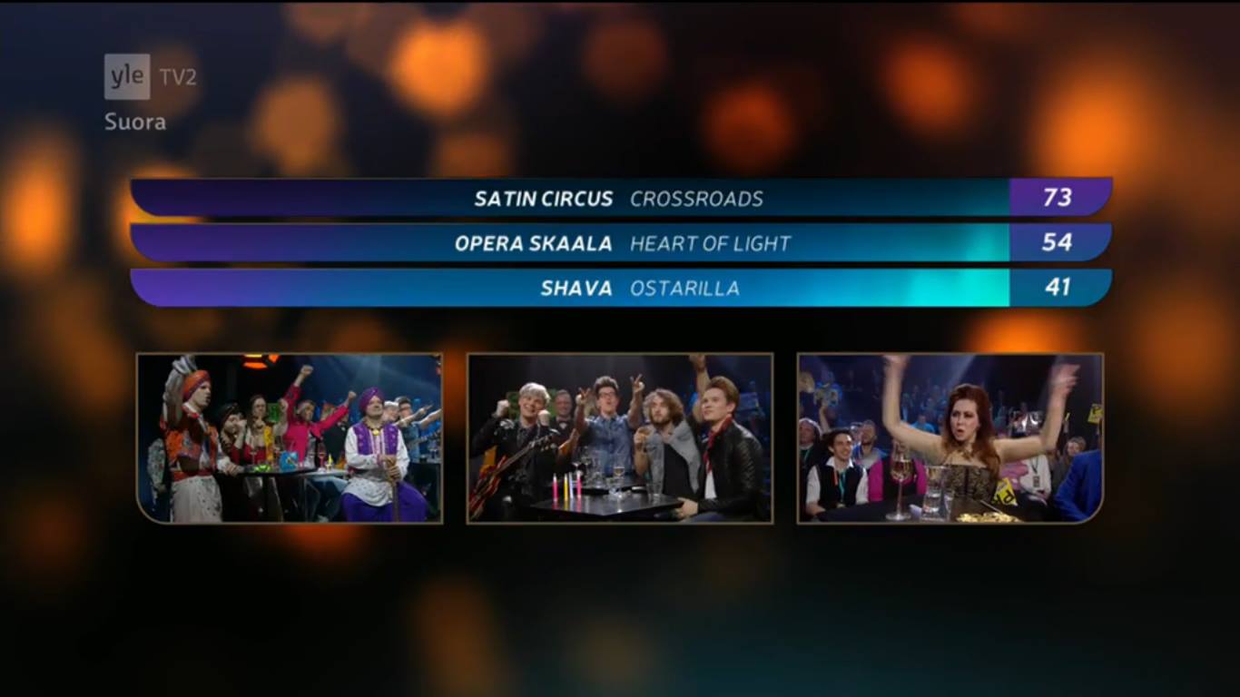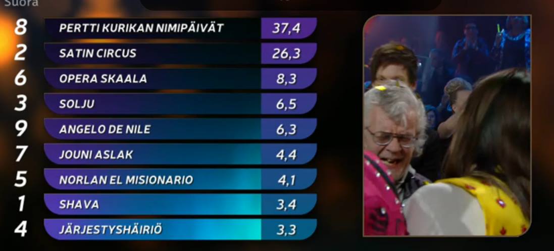 Pobednik je odlučen sabiranjem glasova žirija i publike, i to u odnosu 10% prema 90%. Najviše poena od žirija dobio je bend Satin Circus, zatim Opera Skaala, a na trećem mestu se je našao Shava. Međutim, posle glasova publike koji su ipak činili 90% celokupnog zbira u procentima, pobeđuje muški bend Pertti Kurikan Nimipäivät sa pesmom Aina mun pitää. Zanimljivo je da članovi pobedničke grupe imaju Daunov sindrom, a pesma je kraća od 2 minuta.