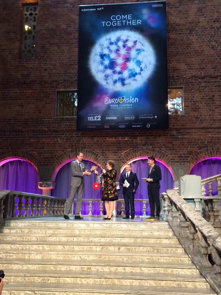 Danas je u gradskoj skupštini Stokholma, održana ceremonija tokom koje je Andreas Mailat-Pokorni, savetnik za kulturu grada Beča, prošlogodišnjeg domaćina ovog takmičenja, uručio ključeve Pesme Evrovizije gradonačelnici Stokholma, Karin Vangord, čime je grad Stokholm i zvanično postao domaćin predstojećeg takmičenja. Ovom prilikom predstavljen je i logo 61. Pesme Evrovizije (videti iznad) kao i slogan „Come together“ (Zbližimo se). Logo je kreirala agencija INGO. Rikard Holst, umetnički direktor INGO-a, objasnio je da logo predstavlja maslačak sa obrnutom funkcijom. Sastoji se iz malih semena, koji će doleteti iz različitih zemalja i okupiti se u magični cvet šireći pozitivnu energiju posredstvom muzike.
