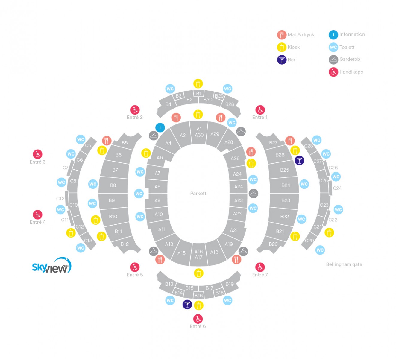(duža = duža strana tribina, kraća = kraća strana tribina, redovi 21-22 su gornji redovi u okviru B nivoa)