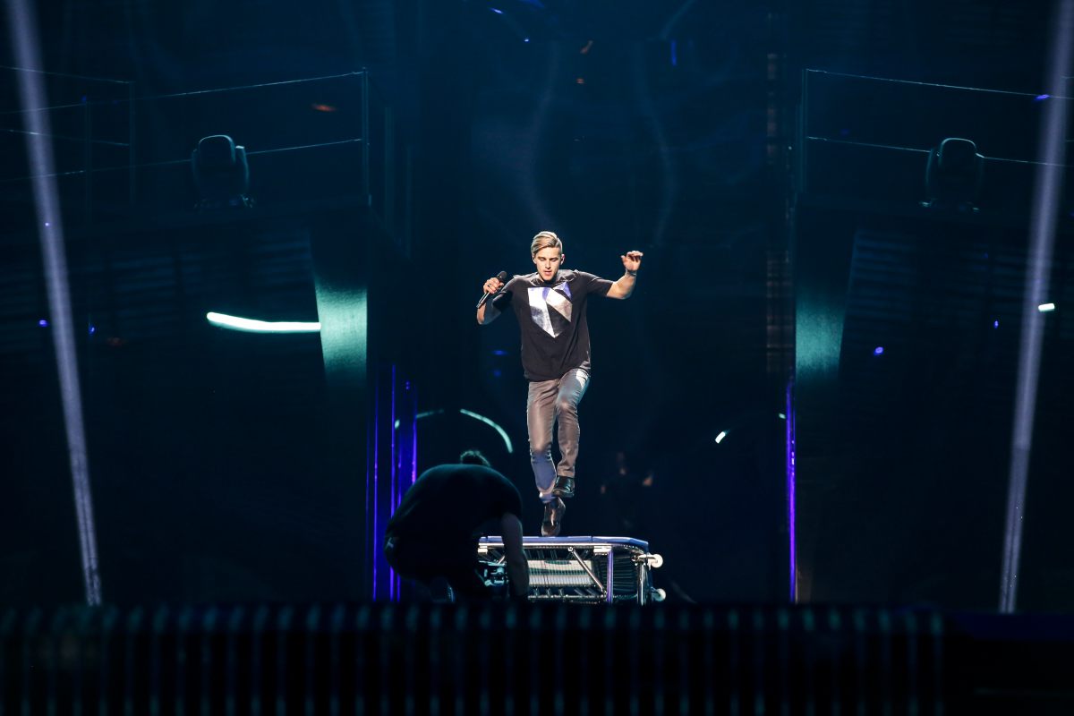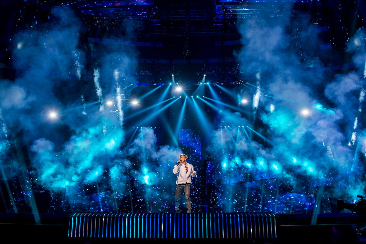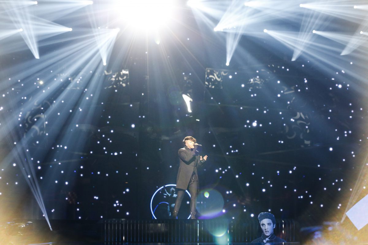 Plava svetla obasjala su arenu. Koreografija Donija Montela se zasniva na konstantom praćenju kamere, Doni je na sceni sam, a neposredno pred deo pesme koji kulminira izvodi nekoliko skokova na trambolini.
