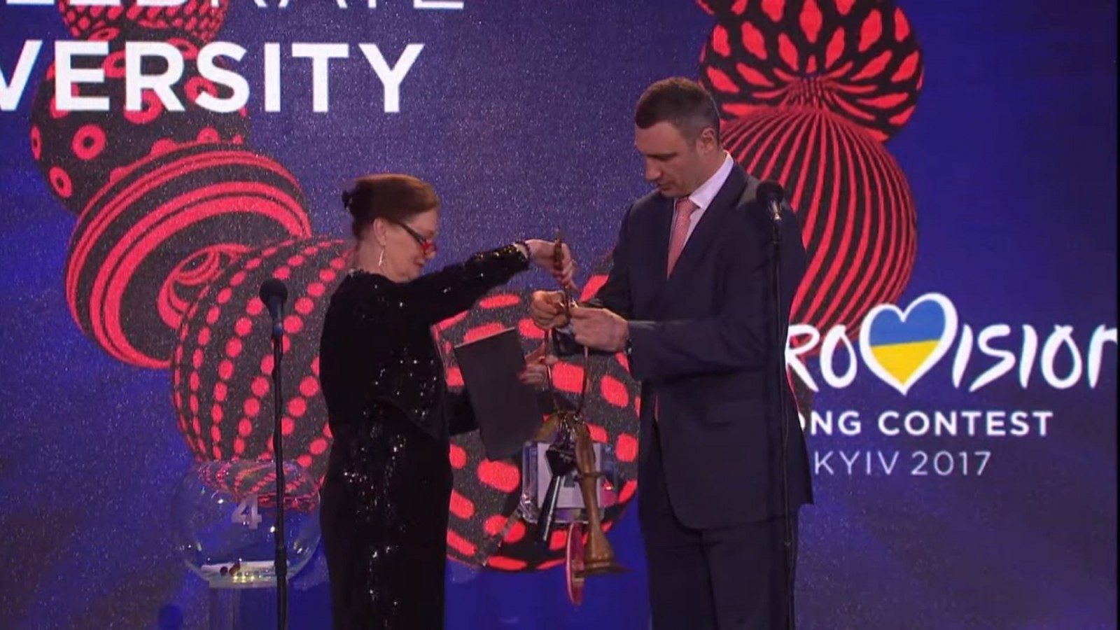 Danas je u Column hali gradske administracije grada Kijeva održana ceremonija tokom koje je Eva-Luiz Erlandson Slorah, predsednica Gradskog saveta Stokholma, prošlogodišnjeg domaćina ovog takmičenja, uručila ključeve Pesme Evrovizije gradonačelniku Kijeva, Vitaliju Kličku, čime je grad Kijev i zvanično po drugi put postao domaćin najvećeg evrovizijskog takmičenja. Program su vodili Nika Konstantinova i Timur Mirošničenko. Prisutnima su se obratili i izvršni supervizor Pesme Evrovizije iz EBU-a, Jon Ola Sand, kao i Viktorija Romanova, izvršni producent Pesme Evrovizije 2017.