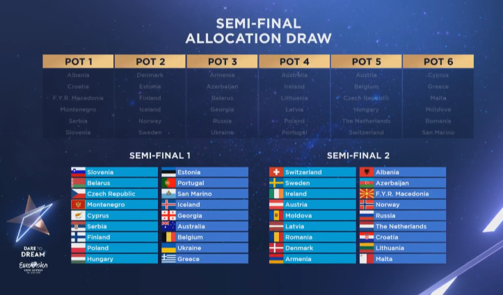 Ove godine na Evrosongu učestvovaće 42 zemlje od kojih će se njih 6 („Velika petorka“ i domaćin) direktno naći u finalu, a preostalih 36 zemalja svoj put do finala moraće da pronađu kroz polufinale (po 18 zemalja u oba polufinala). Voditelji ceremonije žrebanja bili su Lusi Ajub i Asi Azar.
