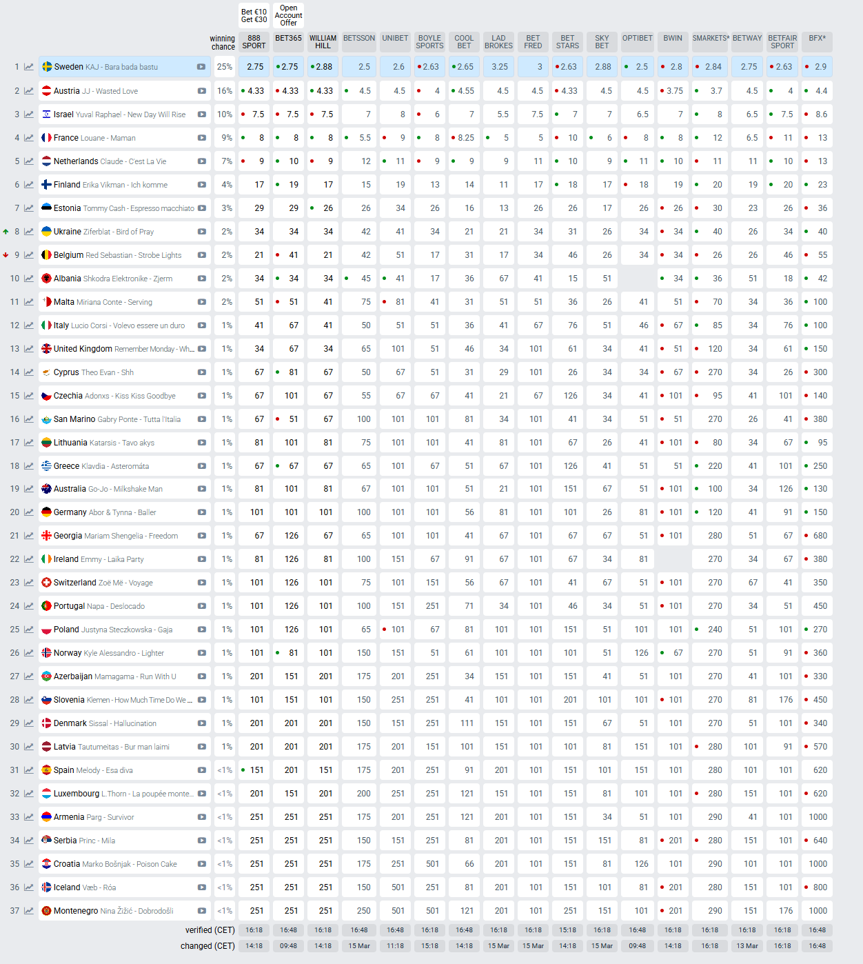 - Holandija (kvota ~11) – Pesma „C’est La Vie“ drži mesto u gornjem delu tabele.