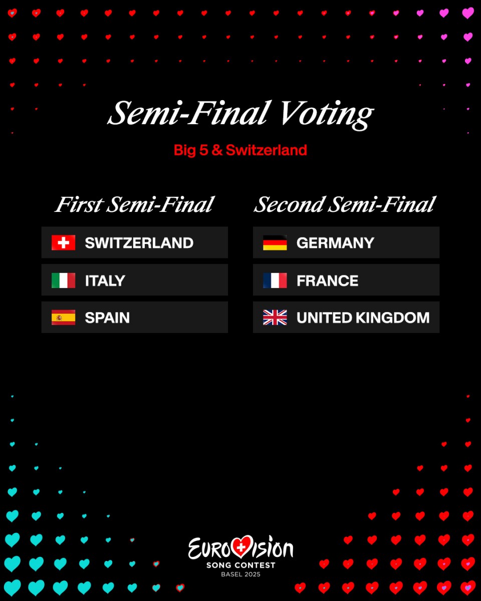 Pored učesnika u polufinalima, određeno je i koje pretkvalifikovane zemlje će glasati u svakom od njih. U prvom polufinalu pravo glasanja imaće i publika iz Španije, Italije i Švajcarske.